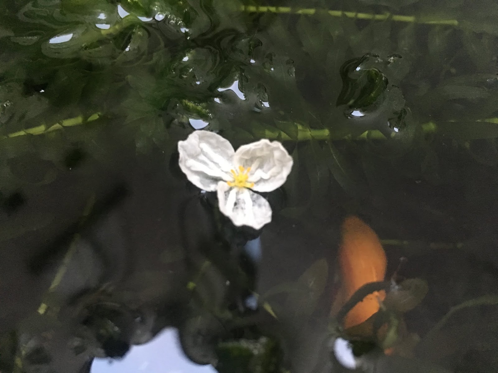 des petites fleurs blanches d'élodées flottant à la surface du bassin...